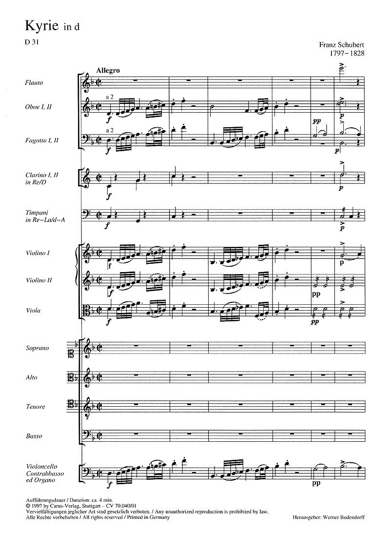 Kyrie für eine Messe in d (VoSoST; Chor SATB; fluit; 2 hobo's; 2 Fagotten; 2 trompet Bb; pauken; 2 violen; altviool; Basso continuo), Orgelauszug