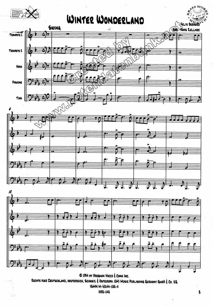 Winter Wonderland - klik hier Winter Wonderland (2 trompet Bb; Hoorn; trombone; tuba), Samenvatting van de partituur en stemverzameling