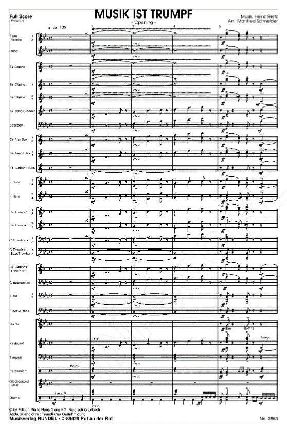 Aanvullende informatie/inhoud De legendarische grote Duitse zaterdagavondshow "Musik ist Trumpf" (1975-1981) werd niet alleen gekenmerkt door de onvergetelijke Peter Frankenfeld, maar ook door de opzwepende titelmelodie van Heinz Gietz. De muziek is ook vandaag nog populair en Manfred Schneider heeft met zijn bewerking een getrouwe uitgave voor blaasorkest gemaakt.
