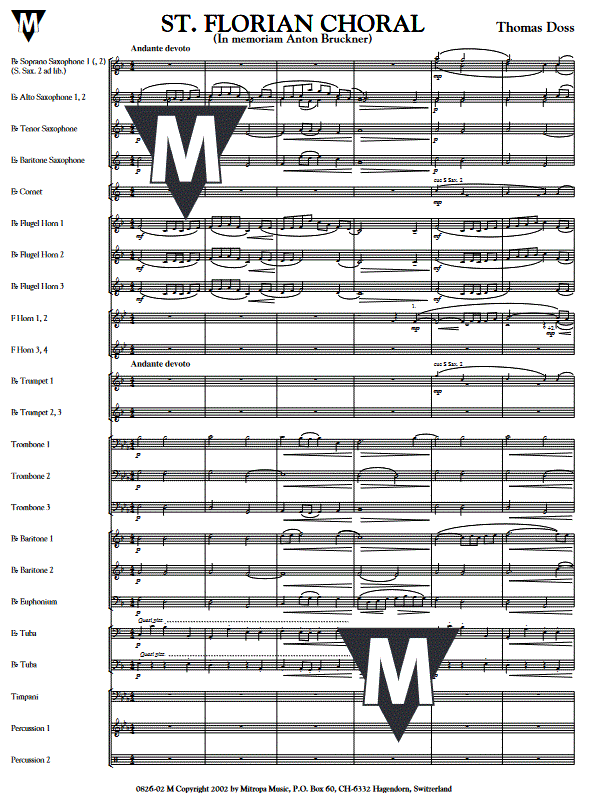 Aanvullende informatie/inhoud De succesvolle componist Thomas Doss schreef dit indrukwekkende koraal als eerbetoon aan zijn landgenoot en rolmodel Anton Bruckner, die veel van zijn onvergetelijke werken schreef in de collegiale kerk St Florian. Met dit eerbetoon heeft Thomas Doss een prachtig muziekstuk gecreëerd dat een waardige aanvulling is op elk repertoire.