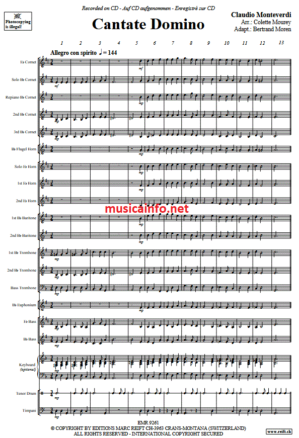 Aanvullende informatie/inhoud Cantate Domino van Claudio Monteverdi is een meesterwerk dat op indrukwekkende wijze de muzikale vernieuwingen van de vroege barok vertegenwoordigt. De compositie combineert polyfone traditie met expressieve tekstinterpretatie en de stijlkenmerken bieden een fascinerend inzicht in de muziekgeschiedenis. Colette Moureys bewerking maakt dit belangrijke werk toegankelijk voor blaasorkesten van lager niveau en levert een waardevolle bijdrage aan de muzikale vorming van jonge ensembles. Het combineert historische authenticiteit met pedagogische praktijk, en bevordert zowel muzikaal begrip als technische competentie. Zo blijft Cantate Domino niet alleen een stuk uit het verleden, maar ook een levendig en krachtig werk voor het muzikale heden.