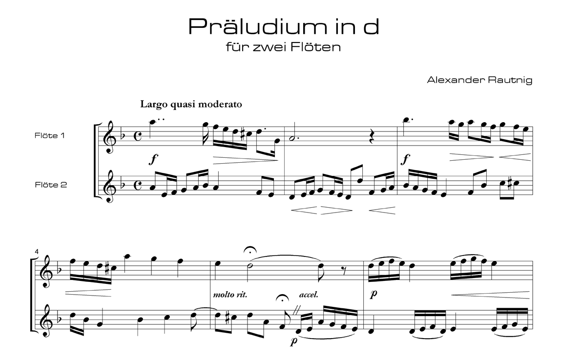 Aanvullende informatie/inhoud Das Präludium in d-Moll für zwei Flöten ist eine zeitgenössische Komposition im Stile einer Invention von J. S. Bach